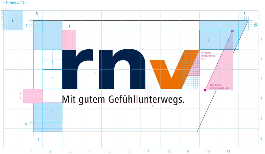 Im Ergebnis ist das neue rnv-Erscheinungsbild einfach, stringent und bietet einen hohen Wiedererkennungswert. Für die praktische Umsetzung sorgen präzise, aber leicht verständliche Anleitungen und Gestaltungs-Templates.